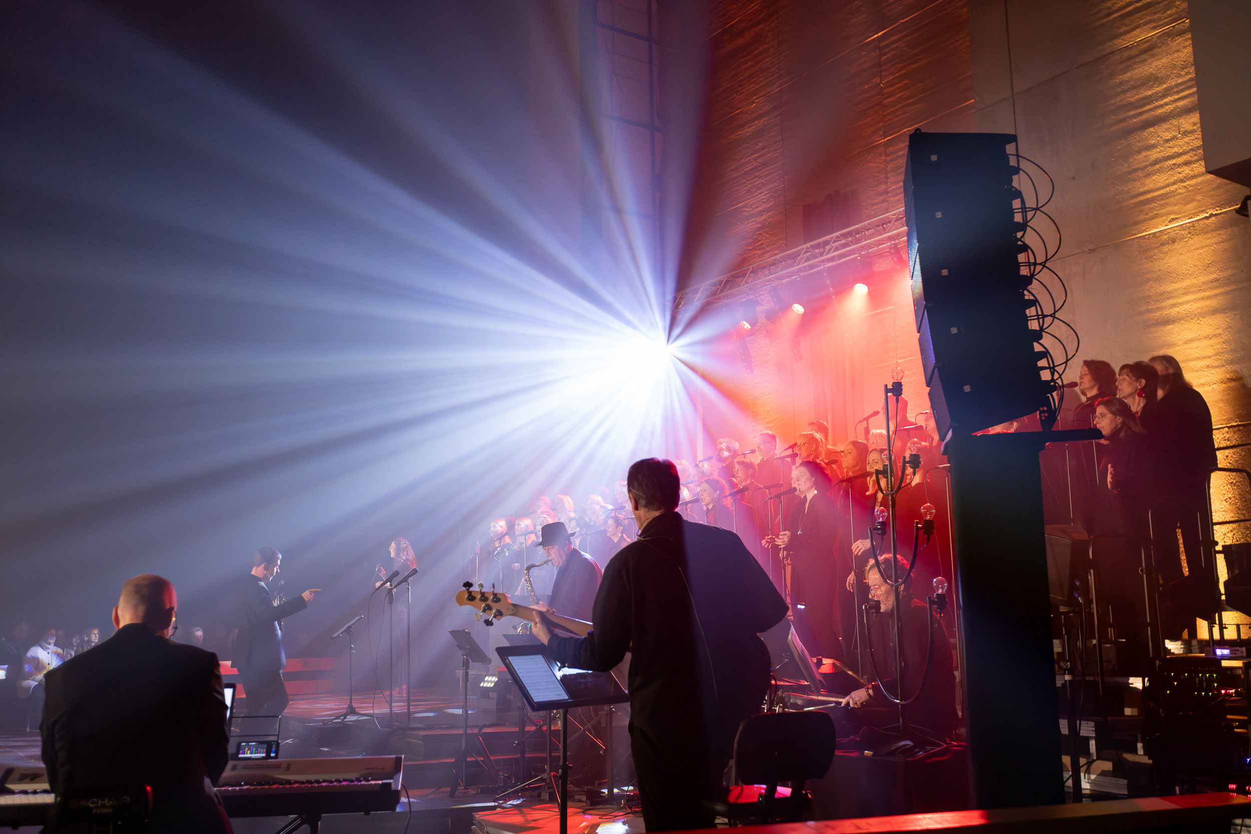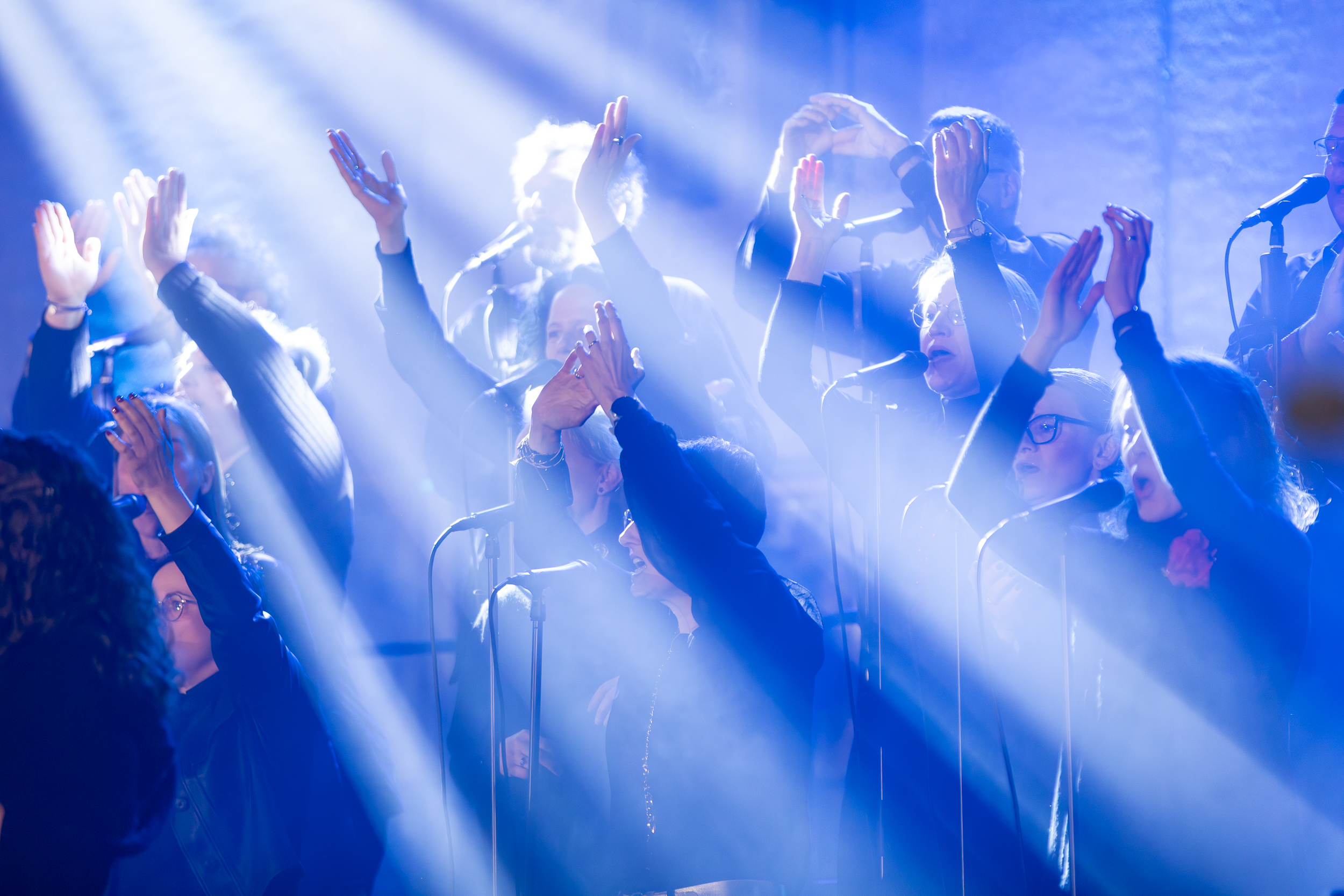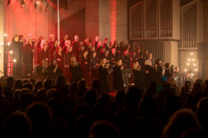 Schon beim ersten Schritt in die blau erleuchtete Kirche lag Spannung in der Luft. Von feierlichen Momenten bis zu groovigen Rhythmuswechseln – die musikalische Reise überraschte, berührte und riss mit. Weihnachtspop, Gospelpower, Disneymagie und neu interpretierte Klassiker sorgten für klatschende Hände, tanzende Kinder und strahlende Gesichter. Weihnachten war plötzlich ganz nah. Getragen wurde dieser Abend von Chorleiter Jonathan Hofmann, rund 50 Sängerinnen und Sängern sowie unserer fünfköpfigen Band – ein Sound, der beflügelte und Raum schuf.